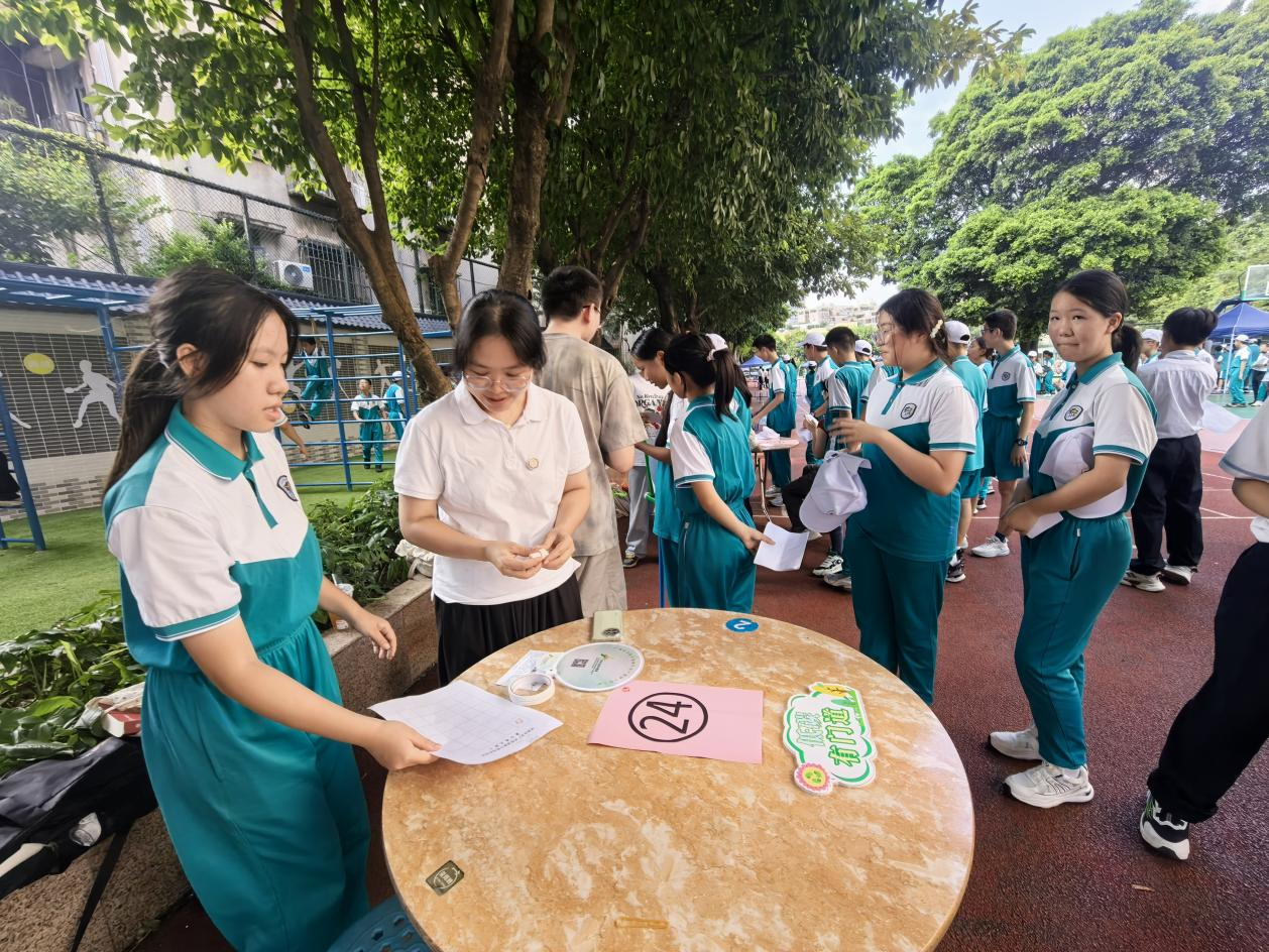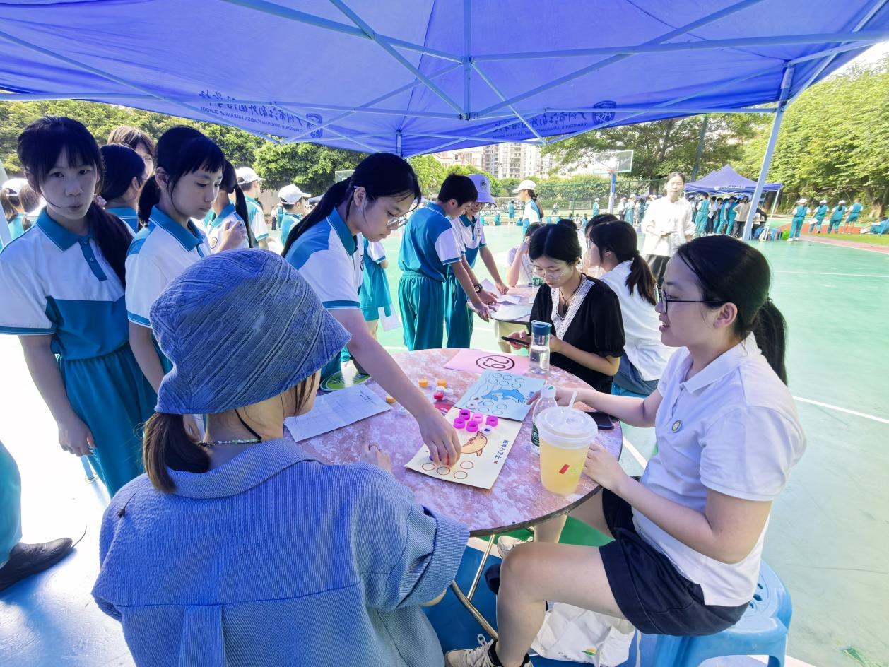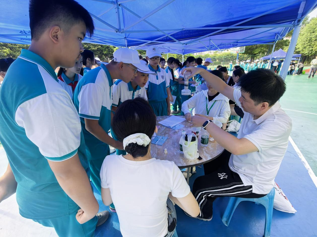 此次接力跑将环保知识挑战与团队协作巧妙融合,为学生们精心打造了一场“生态文明大思政课”。比赛以4人小组为单位,在400米标准跑道的外圈和内圈设置8个主题互动摊位,参赛者在接力棒交接时,需共同完成摊位游戏任务后才能继续奔跑。活动设有“零碳全运·生态广州”“零碳全运·无废广州”“零碳全运·美丽广州”“零碳全运·健康广州”等展位,通过PH测定游戏、趣味转盘、生态拼图和扑克牌游戏等形式,让学生们深入理解环境保护、美丽广州建设、环境健康、碳中和等知识。这种赛制既增添了比赛的趣味性,又让生态文明理念深入人心。完赛后,主办单位为优胜小组颁发由废弃塑料瓶盖再生制造的环保纪念章,这不仅是“变废为宝”的体现,更是活动主题的生动诠释。